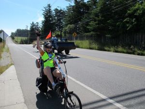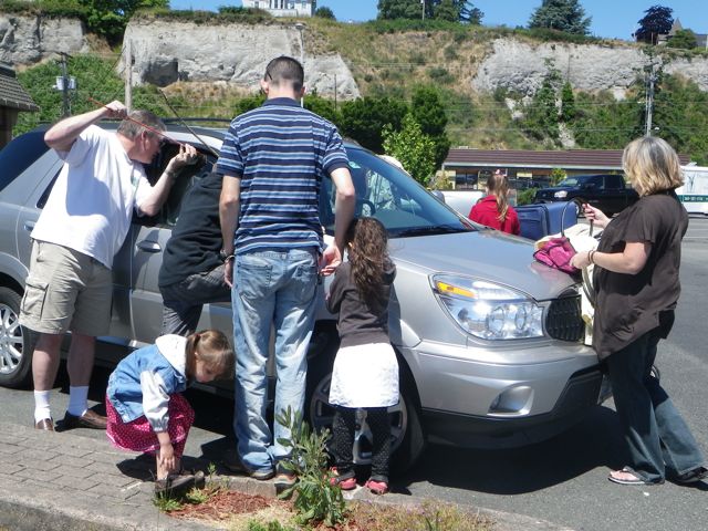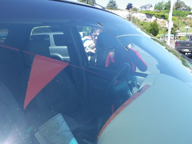 We rode through peaceful neighborhoods. Kristen raced a tractor, and won! We rode the ferry to Port Townsend. Remember my famous Binners Market flag? Well, it got put to good use today. After getting off the ferry, some man came up to us and asked us if our flags came off our bikes. What an odd question. Turns out that he locked his keys in the car and he thought he could unlock it with one of our flags. One flag was too short, but somebody had electrical tape. Two flags didn’t quite cut it. But, two flags with a carbiner taped open to the end were up to the task of pulling the keys out of the ignition! The whole time this was going on, their six or so children were giving advice like: “Next time, don’t lock the keys in the car.” “Leave the widow down more so you can just reach in.” “Bring the keys with you.” Such obvious advice.