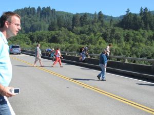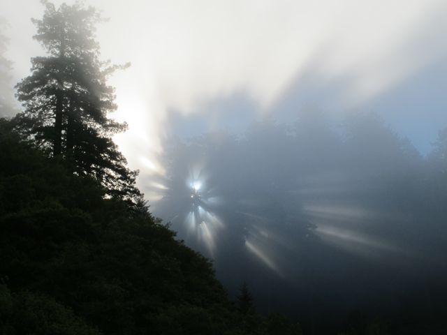 We left the Orman Guest Ranch early to catch the Route 20 bus over a poor section of Hwy 101 just south of Crescent City. We got off at the first stop in Klamath just in time to catch a spectacular sunrise through the early morning fog covering the coastal mountains. Then, just down the road, we stopped to watch the gray whale that had been hanging out in the Klamath River for the past month. It kept swimming back and forth under the bridge. Every time it would swim under, the crowd of onlookers would run across the road (that’s Hwy 101 by the way, which was a big mess around the bridge). Shortly after that, we saw a herd of elk. It was a big mammal day.