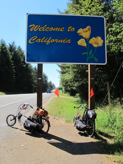 We said goodbye and good luck to the family this morning, and then headed for the California border. It was a relatively flat day. We met some workers at a county beach park just north of Crescent City who had spent the last week cleaning up the park from the tsunami on March 11, 2011. The tsunami did major damage to the harbor in Crescent City. In fact, the man camping next to us (Alex, who has a cute boxer named Tara) was in Crescent City to help rebuild the harbor. He’s in construction and has a difficult time finding work but has recently taken to “following the disasters” for work.