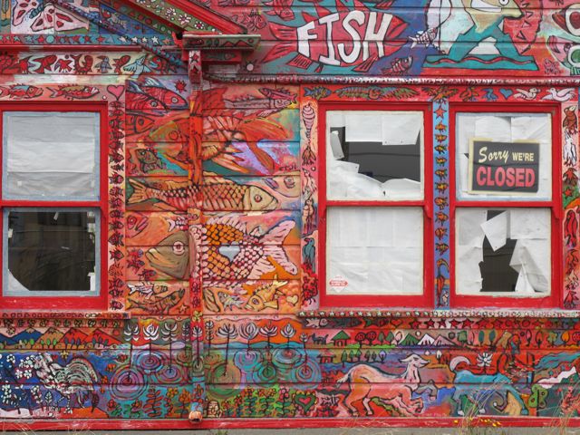 We approached Arcata on a five-mile long bike trail that ran parallel between Hwy 101 and the ocean. This took us past a biker gang, sand dunes, farmland, and even over an old bridge. It was nice to be off the highway and wandering through little places like Smith River. That’s been an interesting aspect of our trip. Our bike maps navigate us through widely diverse parts of the country – sometimes taking us through sparsely populated areas where you have to wonder what the people do for a living because they are so remote, and sometimes through obviously expensive beachfront homes. Two ends of the socio-economic spectrum. Riding through Eureka took us through the low side of that spectrum.