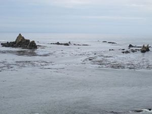 It was raining when we left the campground (South Beach State Park), so much that the Canadians even came back to put on their rain gear. Today was going to be a rest day for us but we decided to ride 15 miles to Waldport to be a little further south because Kristen’s dad was driving up from Eureka, CA to spend a few days with us. We left late, took some pictures when the sun came out, and had breves with Andrew in Waldport.