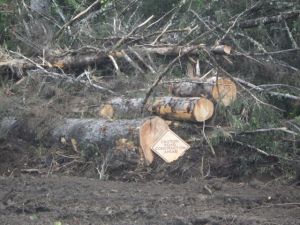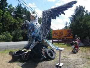 What I rode by: The headwinds and rain. Bald eagle sculpture made out of beach trash. Logging.