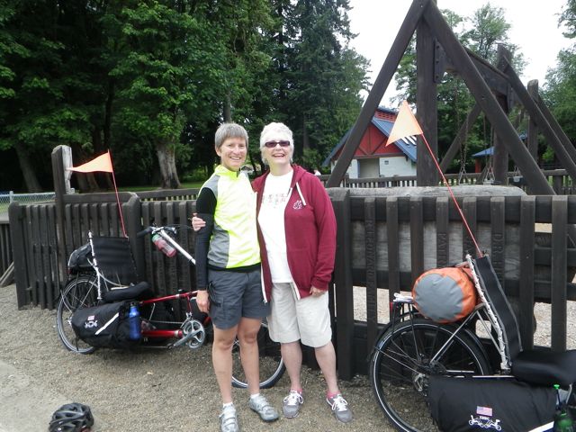 Janice and Martha dropped us off a bit south of Gig Harbor because of the traffic in the area. (They looked after us like we were little ducklings.) Our ride in the morning took us through a logging area. White and yellow wildflowers grew everywhere the trees were thin or young trees were just growing back. I had a breve at our lunch stop for the extra calories. Then we camped at some RV park that had hot showers and was located too close to the railroad tracks. Large, hulking freight trains lumbered by throughout the night blowing their whistles.